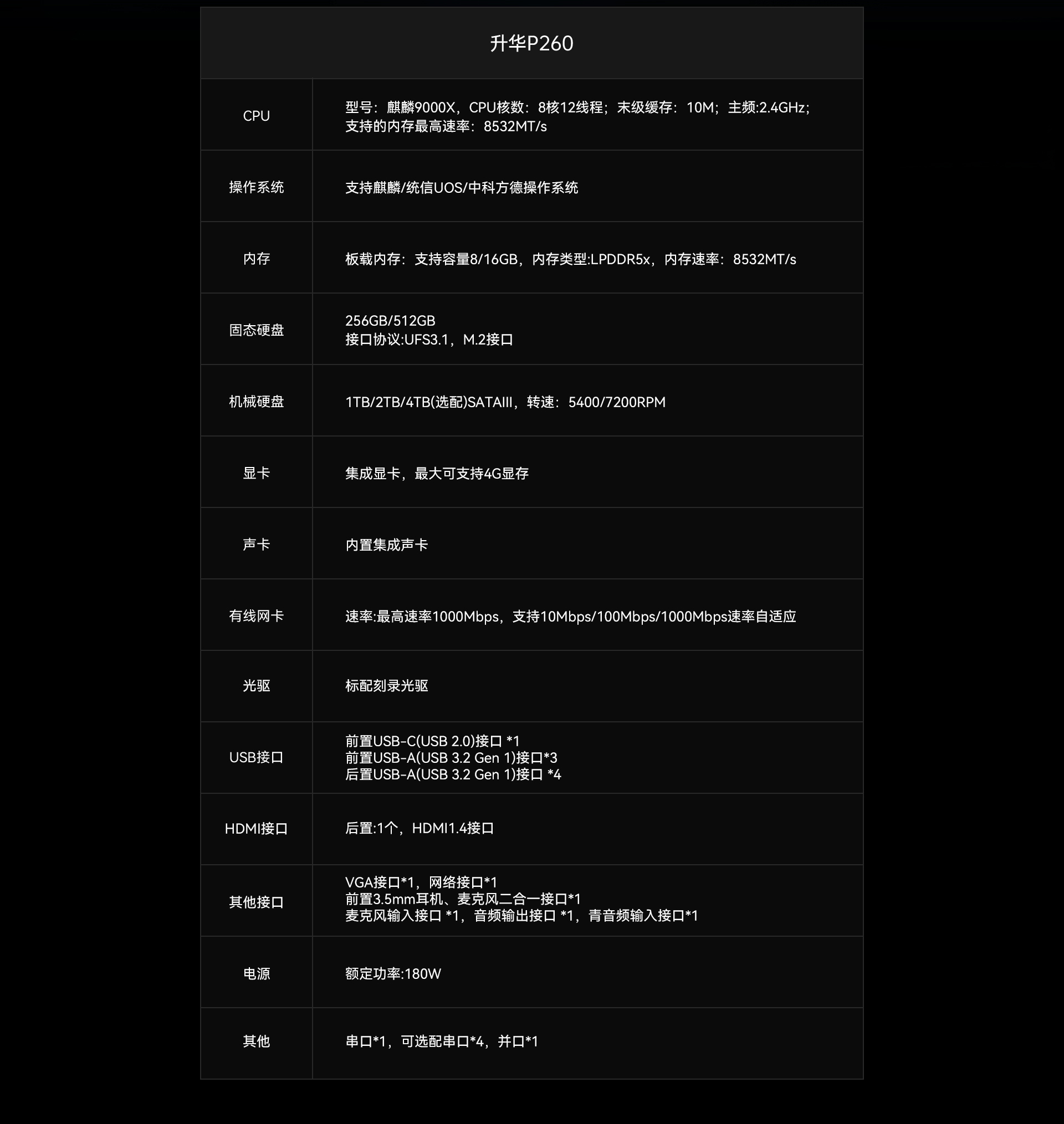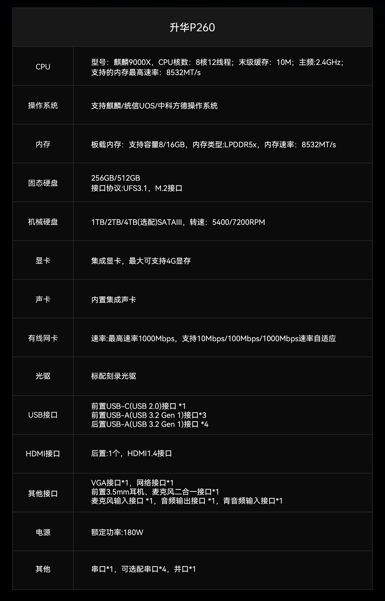 信创台式机升华P260基于最新一代麒麟芯片处置惩罚器