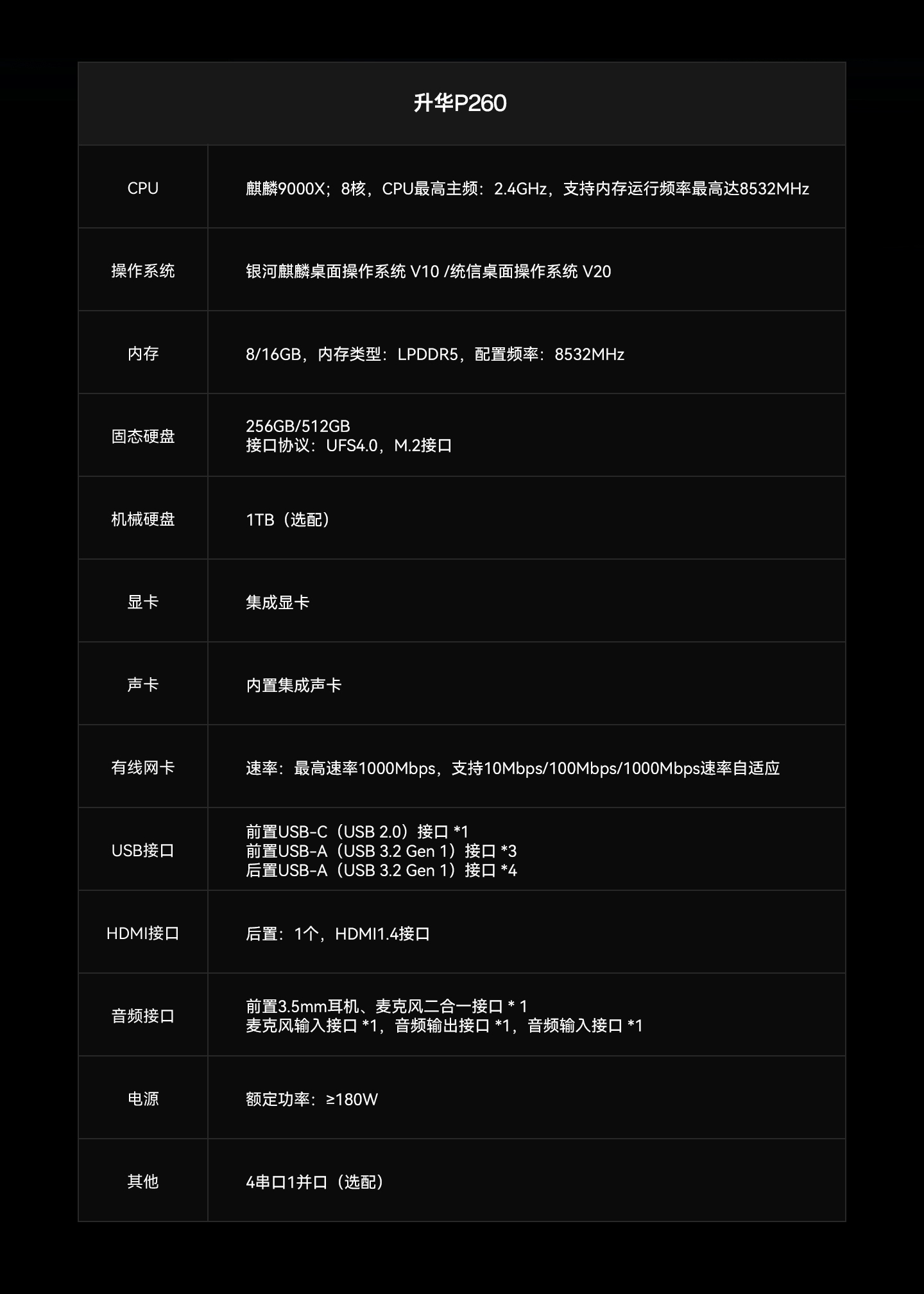 信创台式机升华P260 2,,,,,,,,依托麒麟9000X处置惩罚器修建焦点算力底座,,,,,,,,接纳高性能LPDDR5X高速内存,,,,,,,,内置UFS4.0高速固态硬盘,,,,,,,,整体性能较上一代提升超20%,,,,,,,,实现“算力高效输出、清静纵深防护、运行稳固长效”的三重焦点优势。。。。。 产品搭载清静固件,,,,,,,,深度兼容银河麒麟、统信UOS桌面操作系统,,,,,,,,精准匹配政企、金融、能源、教育等要害领域高清静办公需求,,,,,,,,为“自主可控、清静可靠”筑牢双重防地,,,,,,,,树立国产信创终端新标杆。。。。。