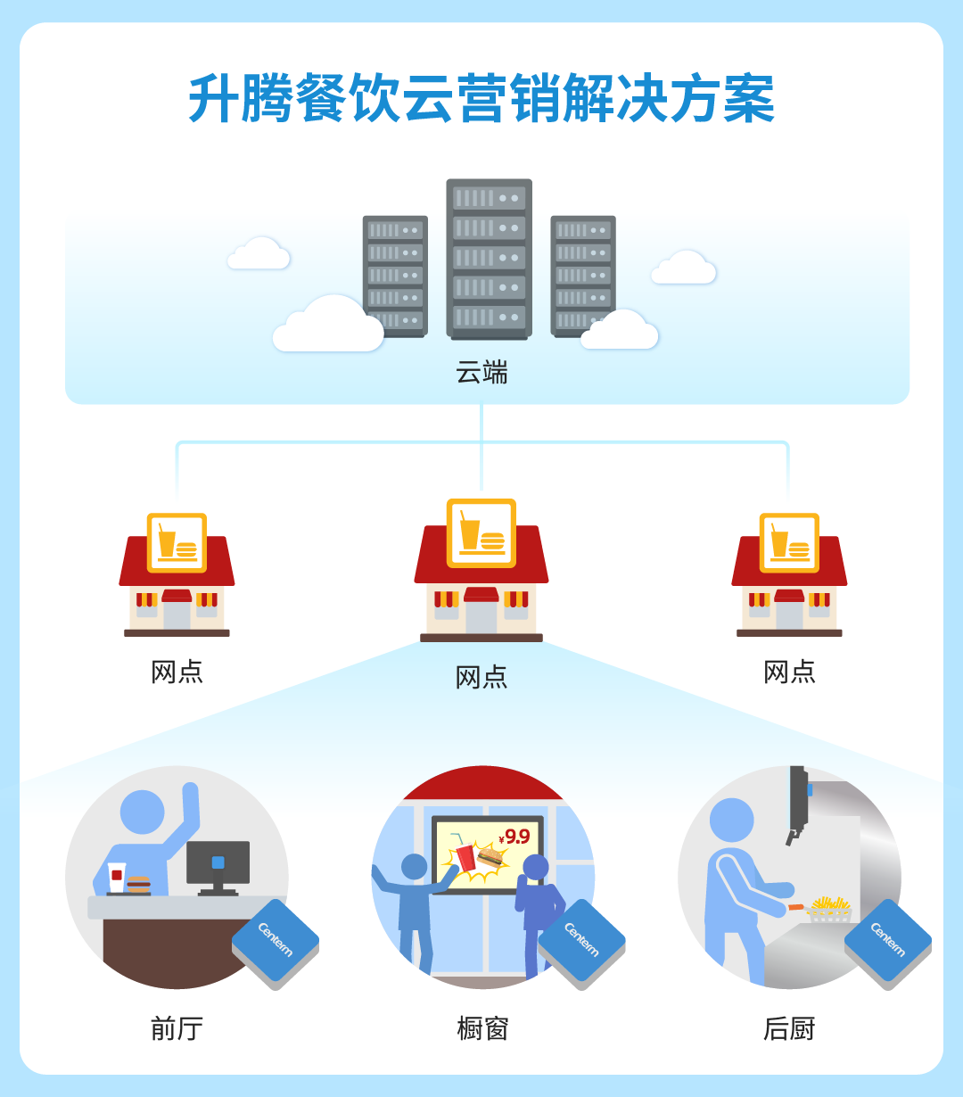 “升腾餐饮云营销解决方案”助力餐饮龙头企业门店智能化升级,让工作人员只需专注为顾客提供更优质的服务,没有后顾之忧。