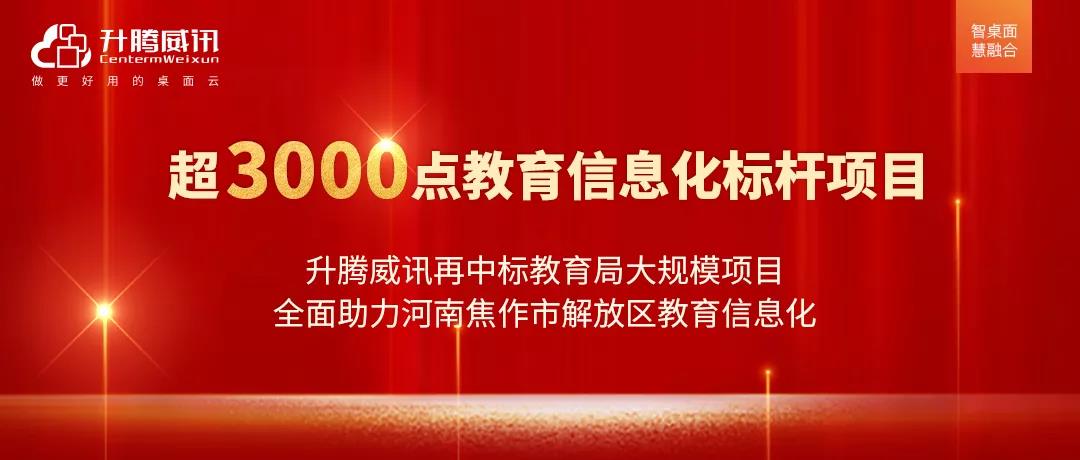 升腾威讯联合合作伙伴在教育行业再中大单,斩获河南省焦作市解放区教育信息化3172点项目,项目涵盖全区28个中小学校区和区教育局的软硬整体解决方案和服务,全面助力提升焦作市解放区县教育云教室、云办公智慧教育信息化环境。