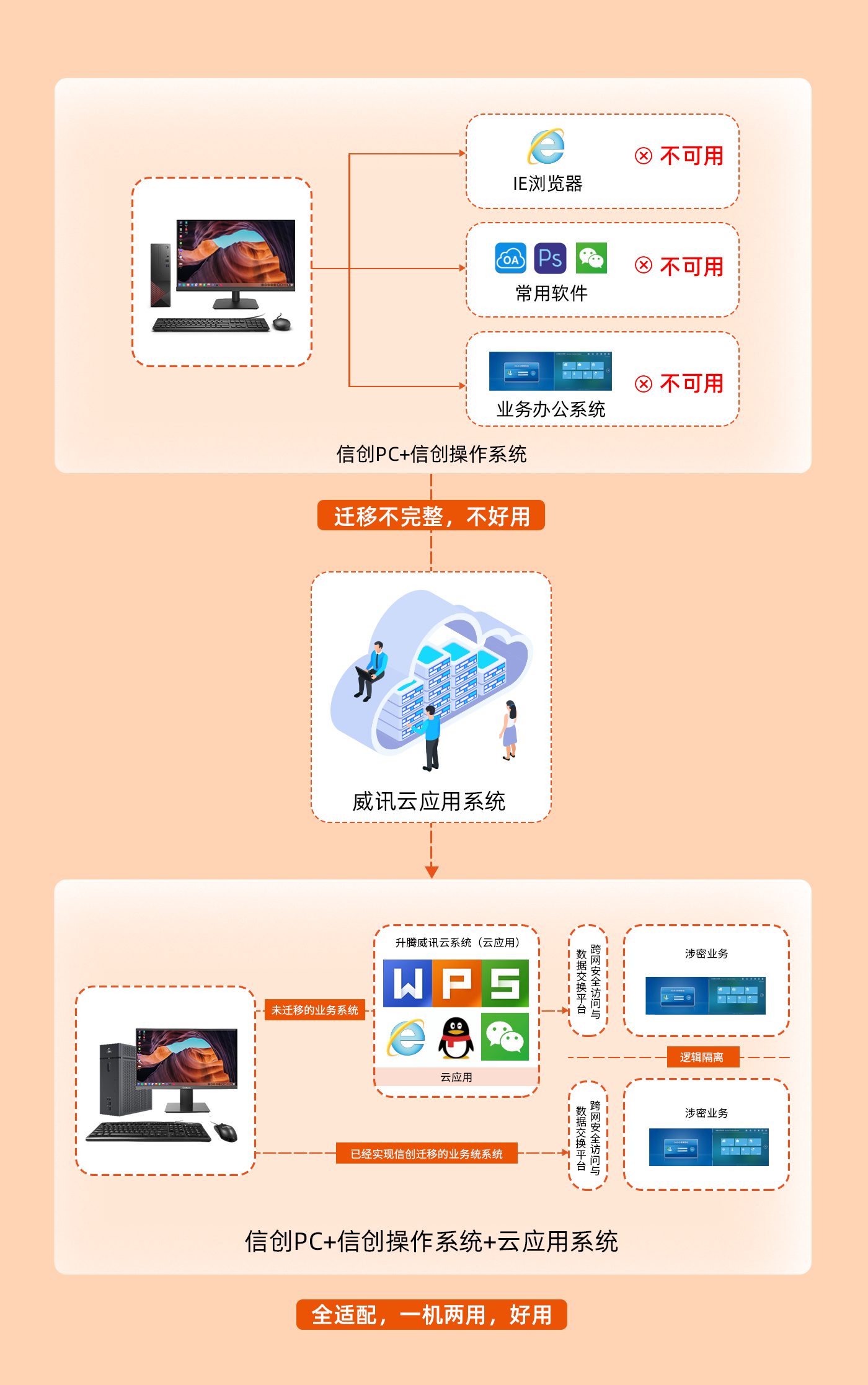 3)对接办公业务系统:党政、公安网内的信创终端,支持从市连接到省的业务系统,确保业务系统流转。