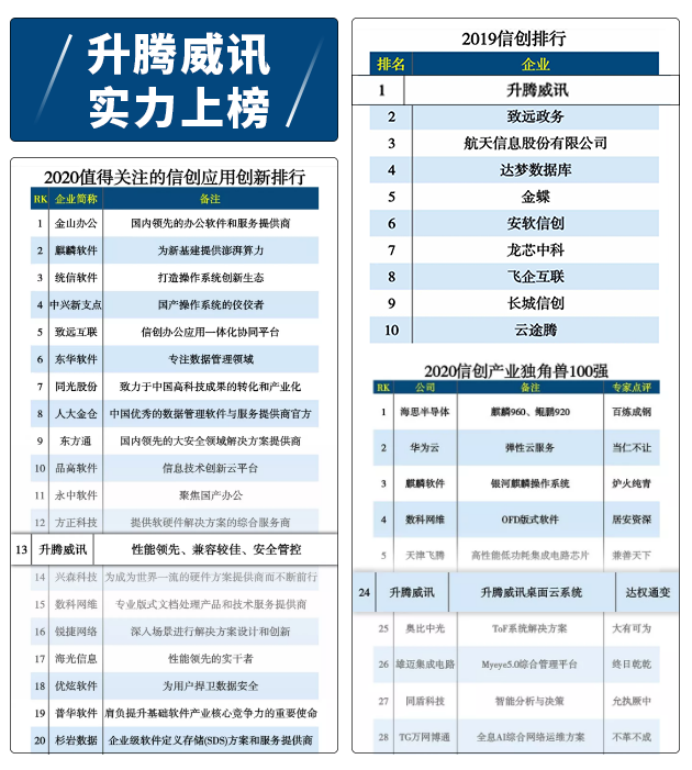 此前,升腾威讯荣获中国信创云排行第一,并上榜2020年信创产业独角兽100强(第24名),是值得关注的信创应用提供商(第13名),一项项殊荣背后,是升腾威讯一步一个脚印走出的自主创新之路。