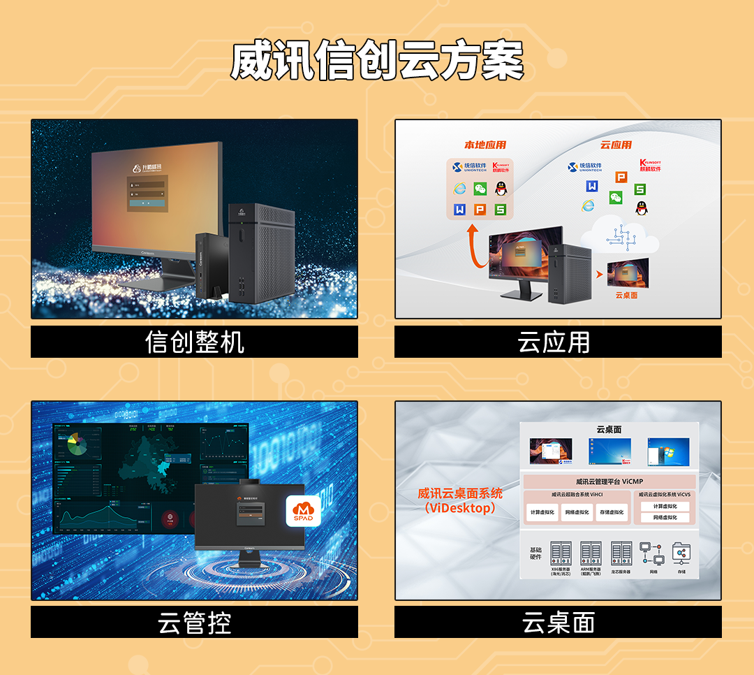 升腾威讯充分发挥自研桌面云技术优势,围绕“云+信创”发展战略,实现“信创整机”、“信创云桌面”、“信创云应用”、“信创云管控”重点布局产品方向,形成党政云办公、金融信创云办公、企业信创云办公等深度融合信创行业场景的整体解决方案,通过云应用、云管控、云桌面等多种方案模式,对应解决党政办公场景中应用迁移、设备管理、数据安全等难题。目前,已经在福建、北京、山东、上海等地项目实际部署上线使用超过5万个点,为党政、金融、能源等行业各类场景带来优异的信创办公体验。