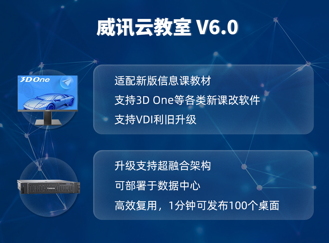 在电子教室场景:最新推出的威讯云教室V6.0,基于原有版本升级,实现更高效能,适配新版信息课程教材改革。