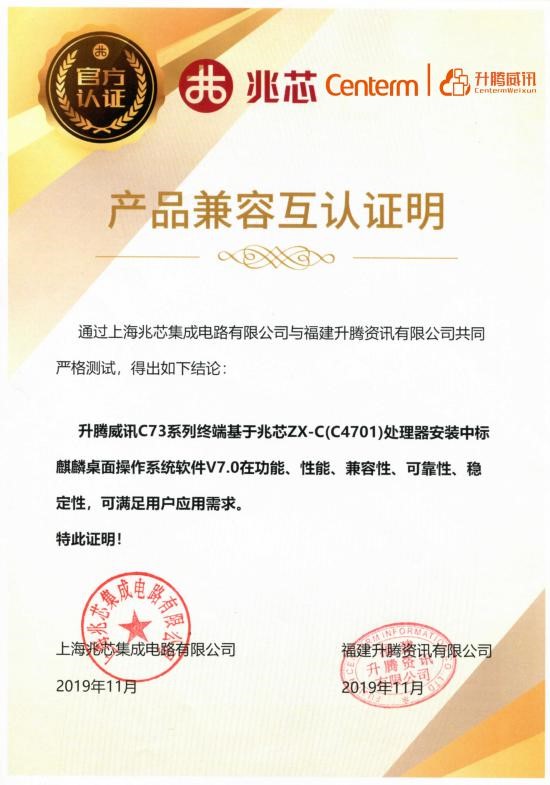 测试结果表明:升腾威讯C73系列终端基于兆芯ZX-C(C4701)、兆芯KX-6000系列安装中标麒麟桌面操作系统软件V7.0在功能、性能、兼容性、可靠性、稳定性可满足用户应用需求。