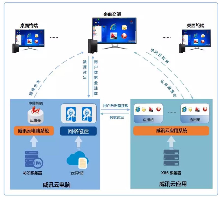 云电脑方案采用了“本地计算+云端管理”的模式,即充分利用终端本地的计算能力,运行系统和业务软件;又利用云端数据及系统镜像管理能力,实现对数据、操作系统集中管理维护。同时结合云应用解决方案,实现国产终端上运行云端未迁移的业务应用,是业界首个能够实现云应用迁移的方案。