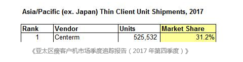 实力见证,续写传奇!据IDC 2018年最新发布的《亚太区瘦客户机市场季度追踪报告(2017年第四季度)》显示,2017年升腾资讯在亚太瘦客户机市场整体出货跃升至52.5万台以上,以31.2%的份额蝉联亚太区榜首,超出第二名近19%,成为当之无愧的亚太最大瘦客户机厂商!