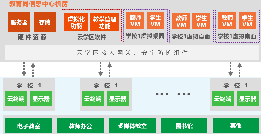 云学区方案具有集中部署、统一管理、简单运维以及灵活拓展等特性,实现全区桌面集中部署统一管控,资源得到最大化,同时利用云学区软件的虚拟化功能和教学管理功能,全面满足学校电子教室教学、多媒体教室教学、教室办公、图书馆阅览室等校园桌面应用场景。