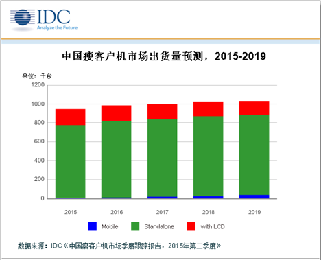 由于云终端解决方案的整体成本优势,瘦客户机在与传统商用PC比较时仍有很大竞争优势。 IDC预测,2015年全年瘦客户机市场出货量约95万台,同比增长约6.3%,预计2019年将增至103万台,年复合增长率 2.5%。经研究分析,未来几年市场有以下几个趋势。