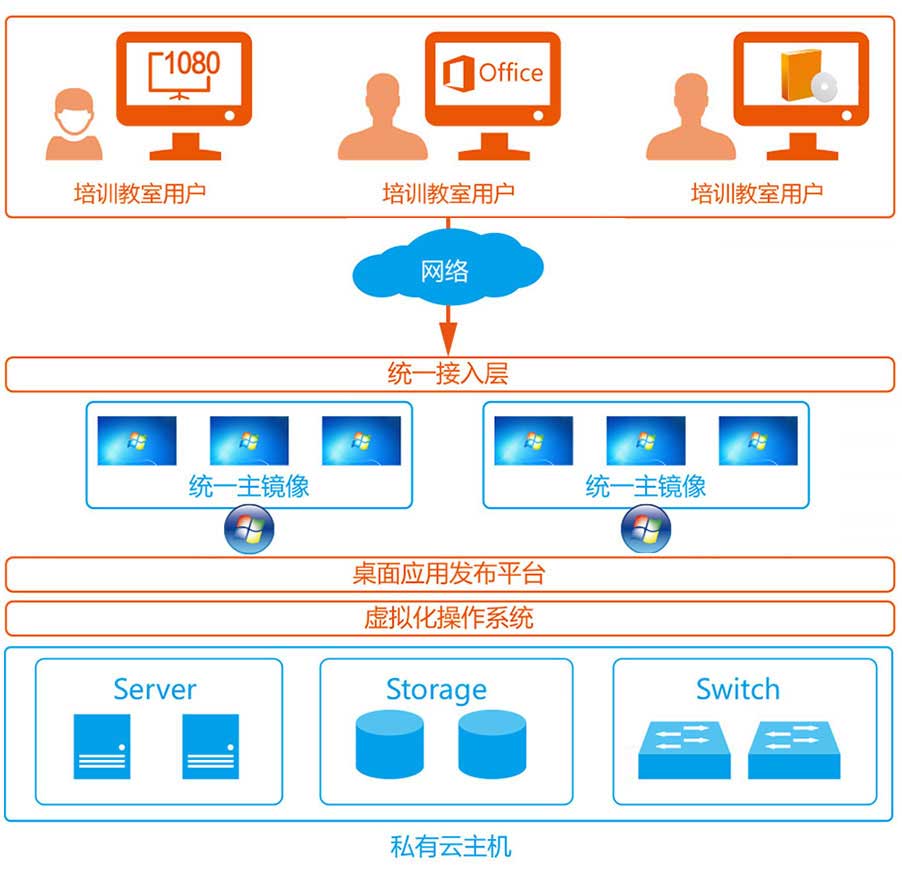 在产品设计过程中,方案特别关注了产品在整体性能、成本及用户体验的平衡,并充分考虑行业培训教室的IT应用与管理现状,在降低成本的同时有效降低产品对部署与运行环境的要求。产品具有快速部署上线、负载密度高、适用范围广、应用体验好、管理复杂性低等特性。