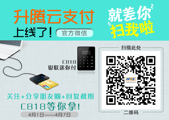 升腾云支付官方微信正式上线啦~~4月1日至7日,关注订阅号升腾云支付并分享至朋友圈,回复截图就有机会抽大奖哦~~